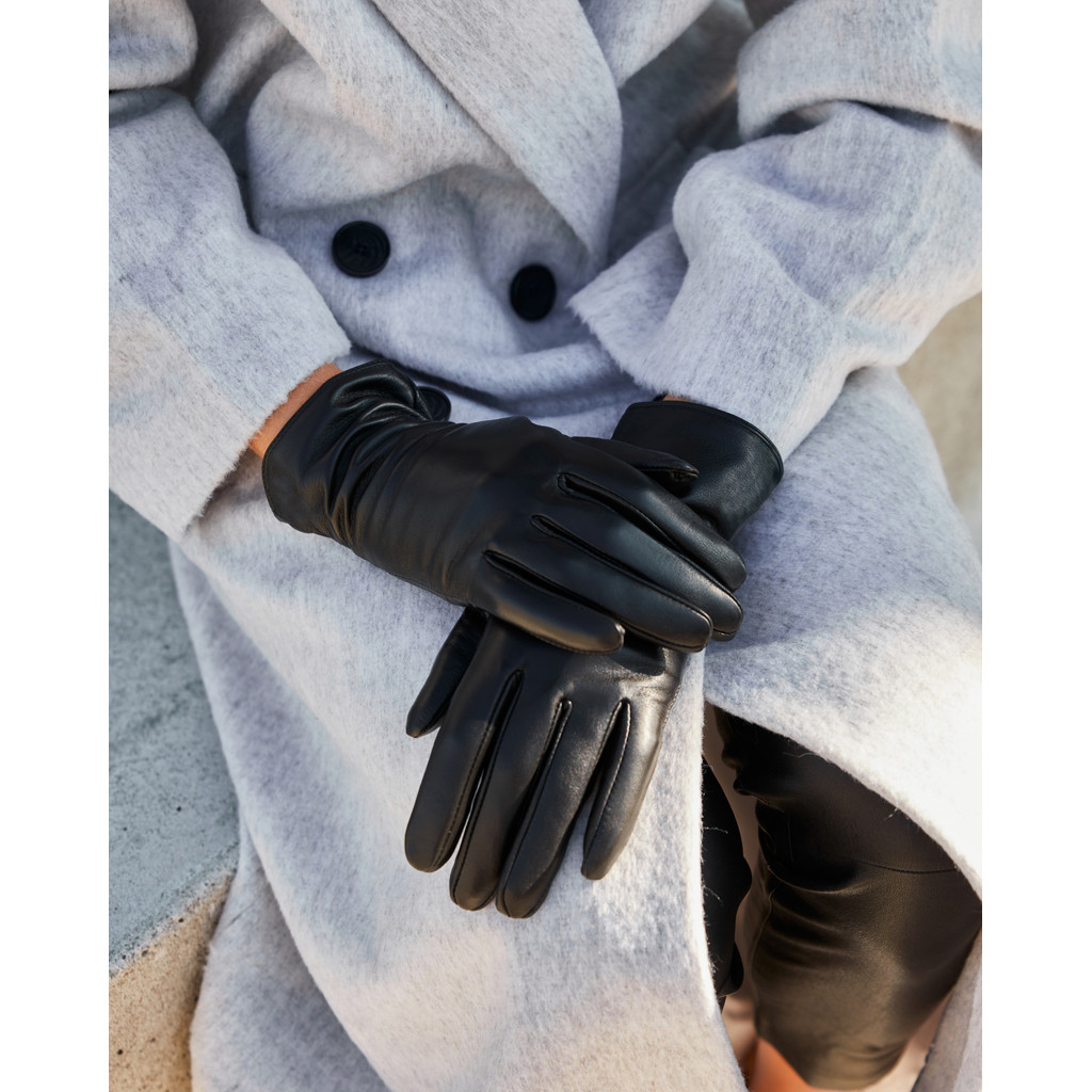 Depeche Læderhandsker i sort er et tidløst musthave i garderoben – klassiske, elegante og fremstillet i den blødeste lammeskindskvalitet. Det enkle design uden detaljer gør dem perfekte til ethvert outfit, uanset om du går efter et sofistikeret eller afslappet udtryk. Handskerne har touch-funktion på pege- og tommelfinger, så du nemt kan bruge din smartphone, og det bløde fór af 70% uld og 30% akryl holder hænderne varme og komfortable hele vinteren. Et stilrent og funktionelt valg, der kombinerer luksus, kvalitet og hverdagspraktik på smukkeste vis.