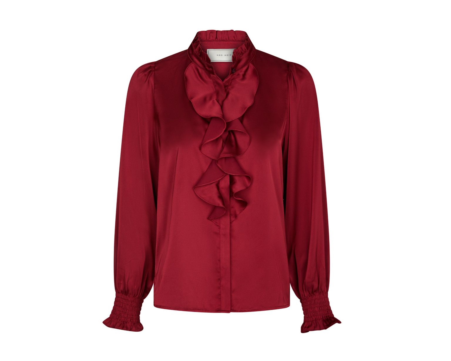 Zamola blusen fra Neo Noir i Dark Red er et elegant statement-piece, der kombinerer klassisk femininitet med et moderne touch. Den smukke blanke kvalitet fanger lyset på den fineste måde, mens de delikate flæser langs fronten og ved halsudskæringen tilfører et romantisk og sofistikeret udtryk. Blusen har lange ærmer med smock-detaljer ved håndleddene, der giver en flatterende pasform og en let voluminøs silhuet. Den dybe røde farve skaber et luksuriøst look, perfekt til både hverdag og festlige anledninger, hvor du ønsker at skille dig ud med et tidløst men samtidig iøjnefaldende valg. Style den med elegante bukser eller et pencil skirt for et chic kontorlook, eller kombiner den med jeans og hæle for en mere afslappet, men stadig glamourøs styling.