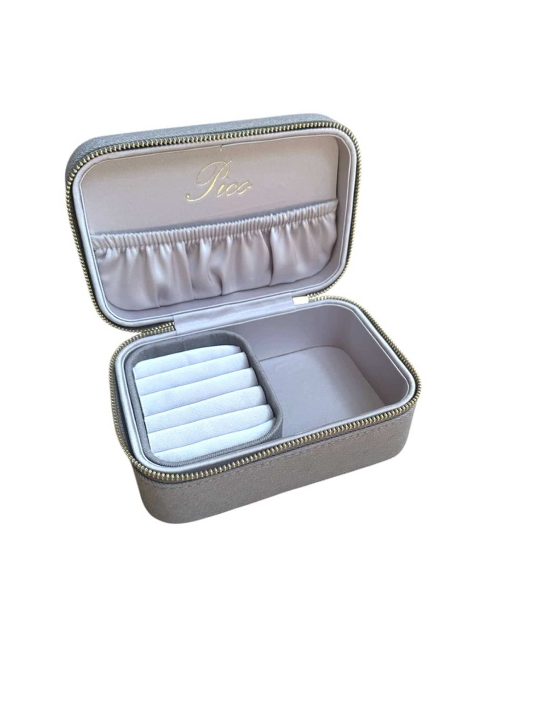 Large Smykkeskrin fra Pico Copenhagen i farven Ash Grey er en elegant og rummelig løsning til opbevaring af dine smykker, ideel til både hjemmebrug og rejser. Det stilrene design i en afdæmpet grå nuance kombineret med en gylden lynlås og blød, satinforet inderside udstråler eksklusivitet og omtanke. Smykkeskrinet indeholder en praktisk elastiklomme i låget, et aftageligt indlæg med plads til ringe og ørestikker samt et stort rum til halskæder, armbånd og andre favoritter. Det hårde ydre beskytter effektivt dine smykker, mens den velorganiserede indretning gør det nemt at holde overblik.