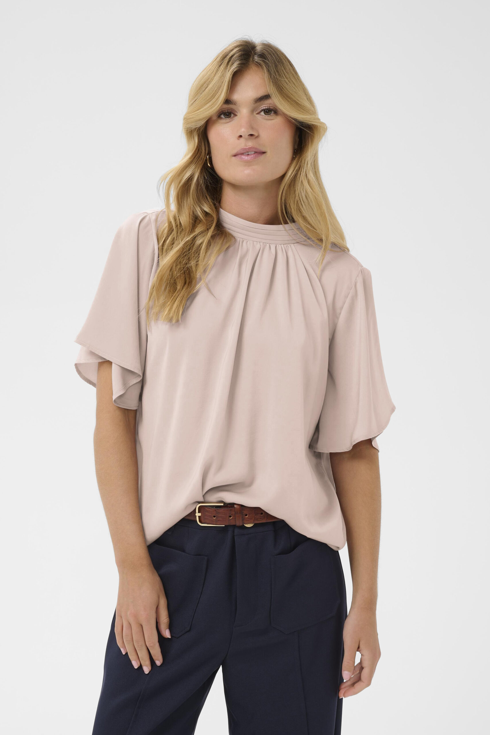 Aileen blusen fra Saint Tropez er en elegant og alsidig style, der kombinerer et regular fit med feminine detaljer. Den kommer i den smukke lyserøde farve Sphinx og har ærmer, der går til lige over albuen, hvilket giver et let og sofistikeret udtryk. Den flared pasform skaber en flatterende silhuet, der er nem at style både til hverdag og mere festlige anledninger. En tidløs tilføjelse til garderoben, som hurtigt bliver en favorit.